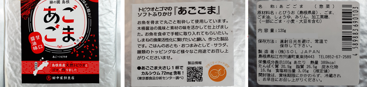 一つ目は、島根県の県魚であるトビウオ(飛魚)を原材料とした商品、トビウオとゴマのソフトふりかけ『あごごま』です。