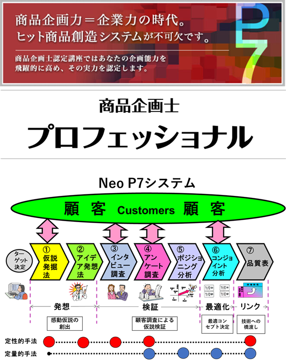 「JMLA商品企画士プロフェッショナル」は、感動商品の企画を系統的に実現するNeo P7(ネオ ピーナナ)(新・商品企画七つ道具)のスキルを身につける資格講座です。
